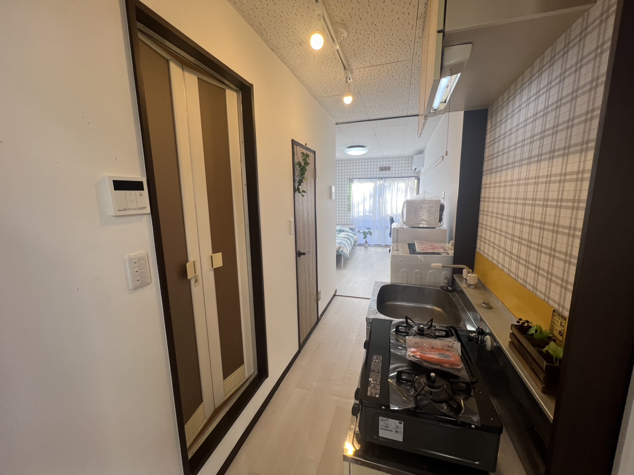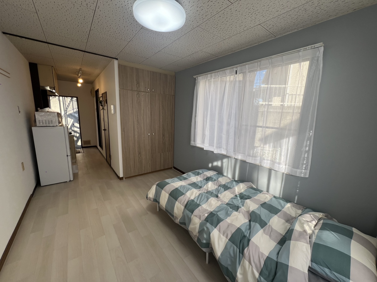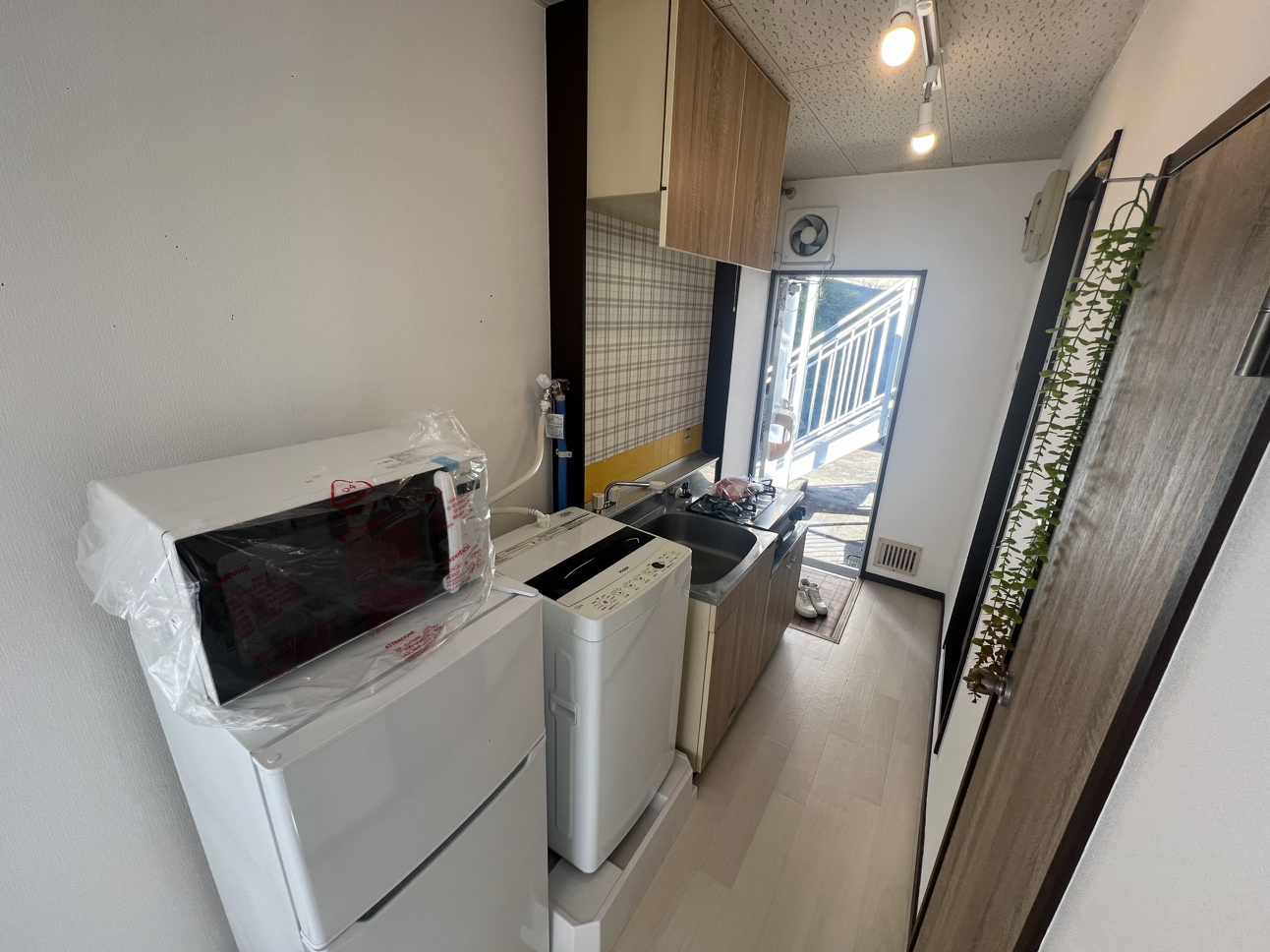 エアコン、ガスコンロ、カーテン、電子レンジ、冷蔵庫、そろって便利です